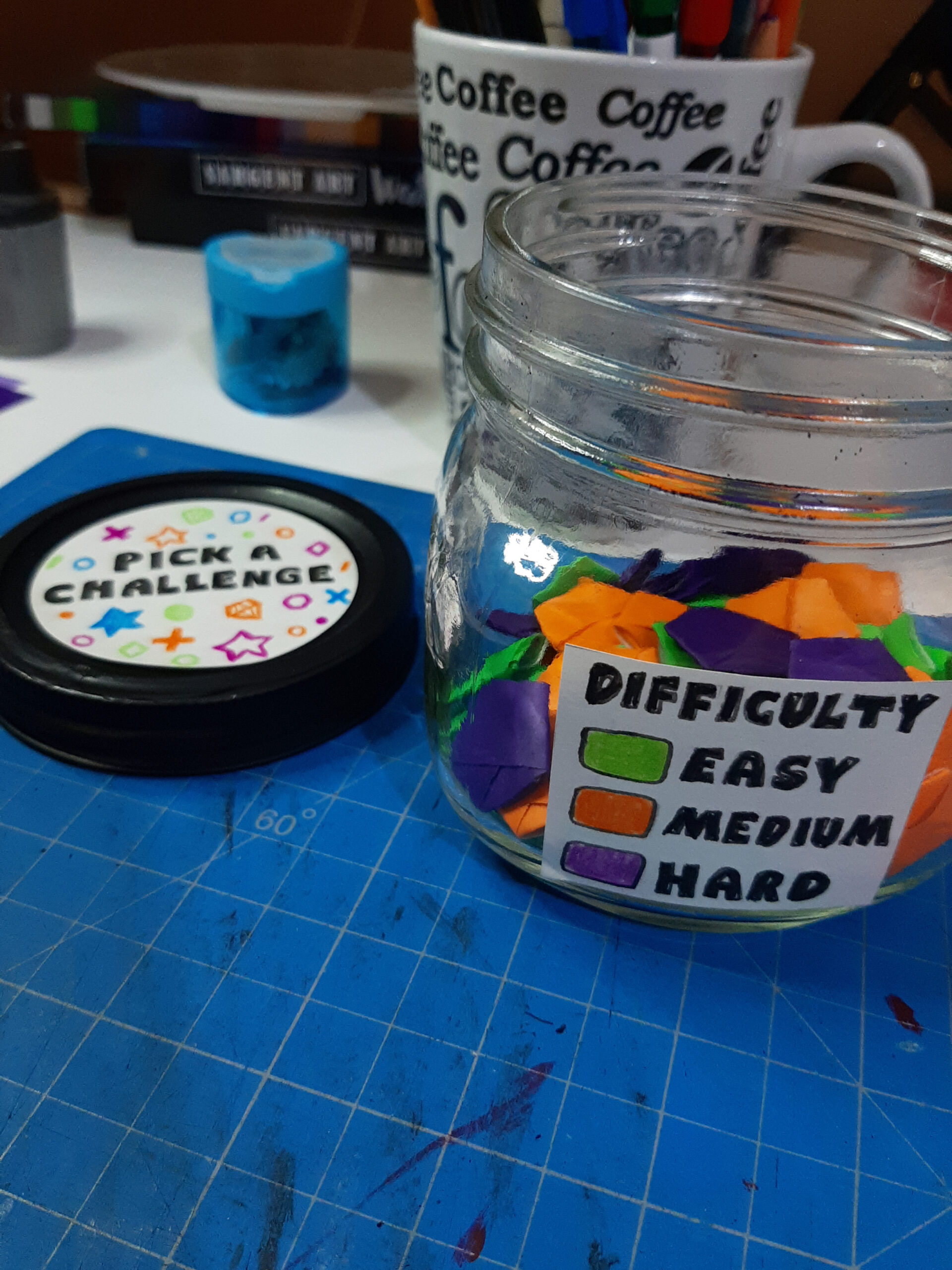 I learnt multiple new skills for this project, but the most difficult was video editing. I learnt how to use Davinci Resolve, a free video editing software and watched a lot of tutorials to prepare myself. I also learnt more about myself and what would motivate me to be more consistent. It was rare for me to make art outside of requests, gifts, work and school projects. Setting up a system with simple rules allowed me to pick an art-related task, which earned me XP (Experience Points). There were colour-coded challenges from easy to difficult, and I wrote them on paper, folded them and stored them in a mason jar: